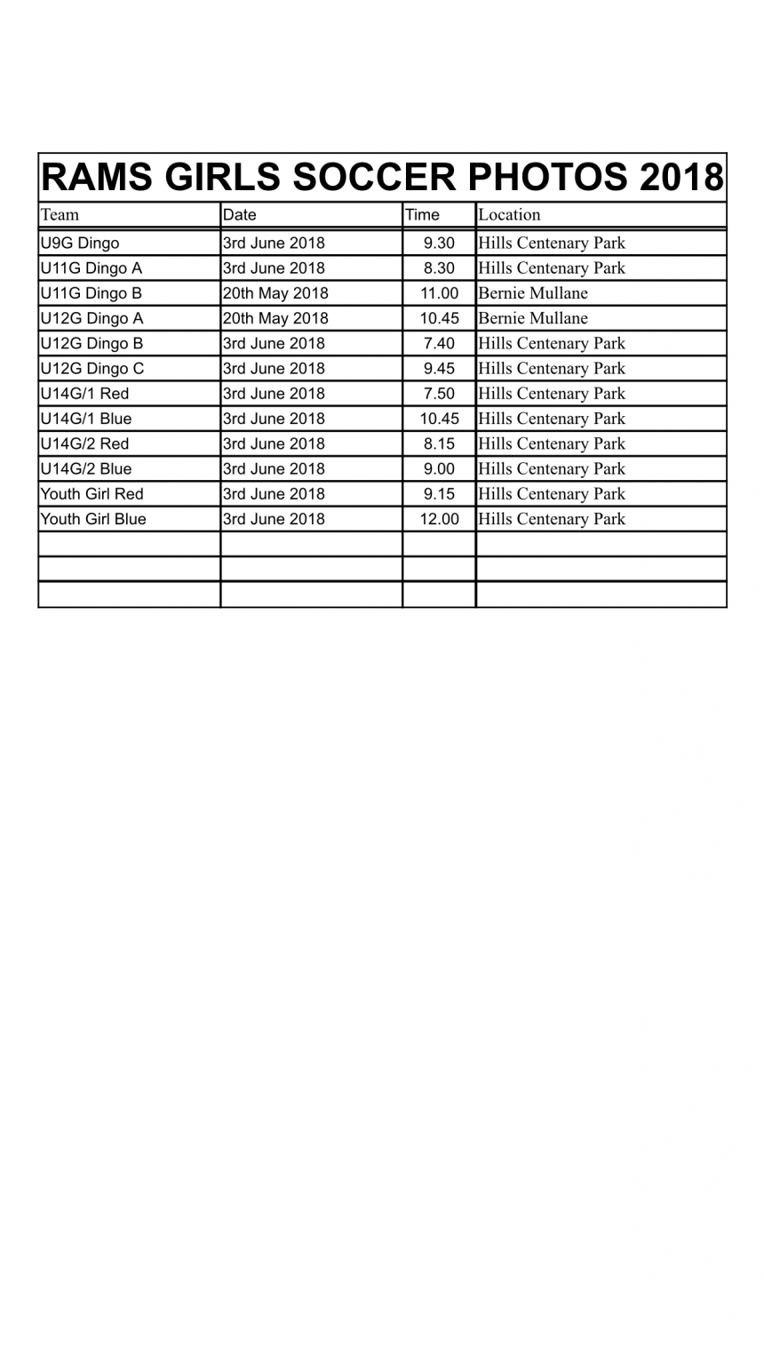 Strawberry Jam Photography, do our Rams Soccer photo’s for players and teams. Please see attached the schedule for photos in the following weeks. Please ensure you are aware of your teams time slot and endeavour to arrive at least 5 mins before. Pse note that time slots have been coordinated to best suit your play time as best as possible. Pleas let your teams coach or manager know if you are unable to make it.