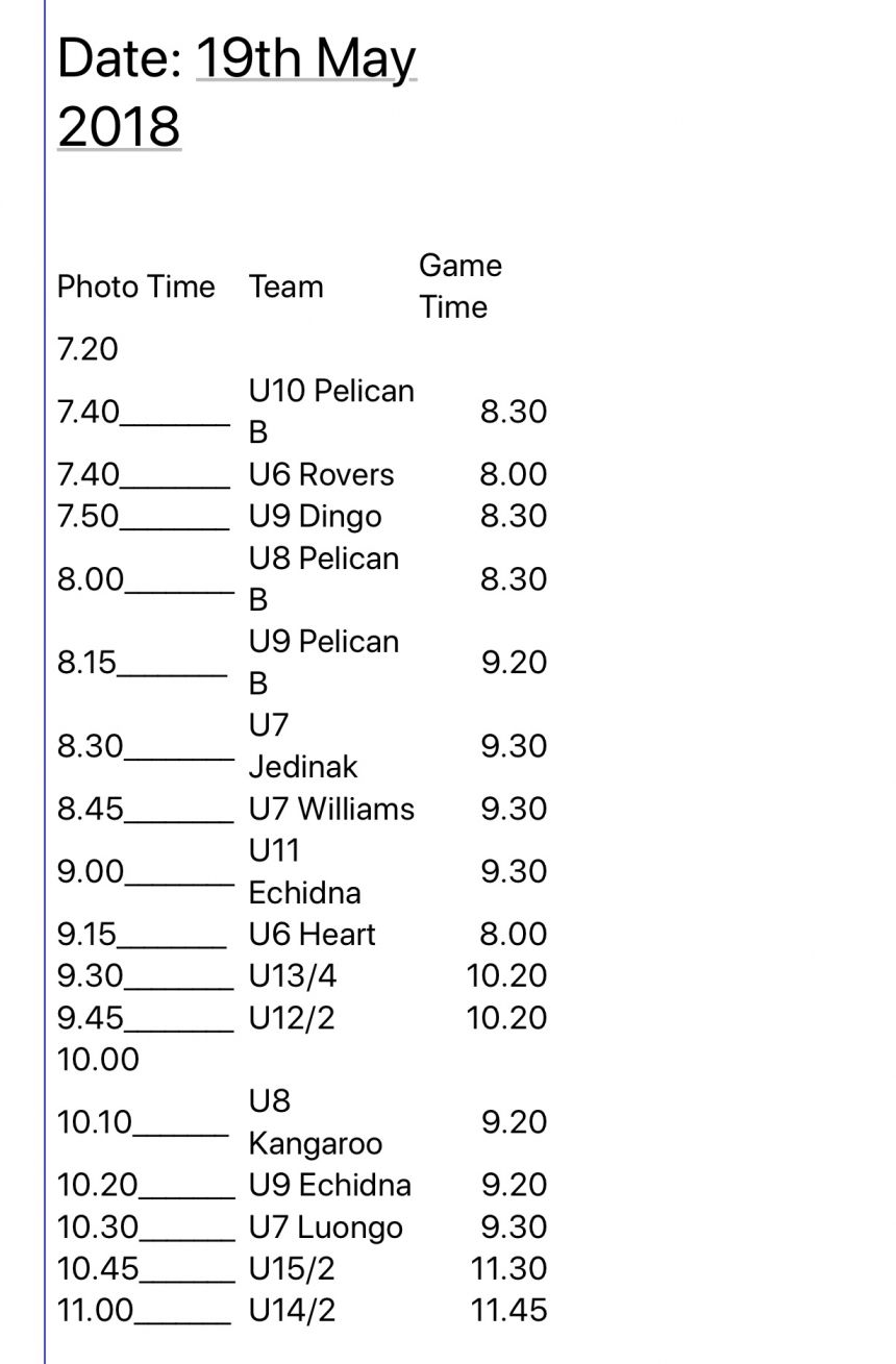 Here is the revised Photo schedule for 19th and 26th MAY.This has been changed due to re grading as well as State cup draw.Please Check you time slot and location Even if there are no Changes to your game.You may have been shuffled to accomodate another team who has changed times.Please contact me directly on 0411 789 177 if you have any queries about your time slot.VickiStrawberry Jam Photography