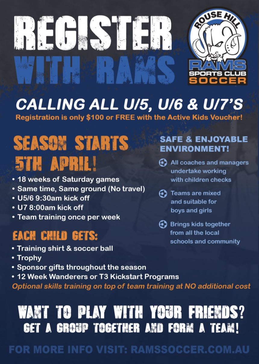 Only a few spots remaining!! Games are played at Hills Centenary on Saturday morning. Don’t miss out! Register today go to                          ramssoccer.com.au #playsocceratrams #rousehillramssoccerclub #ourclubisbetterthanyourclub #GOROUSEHILLRAMS