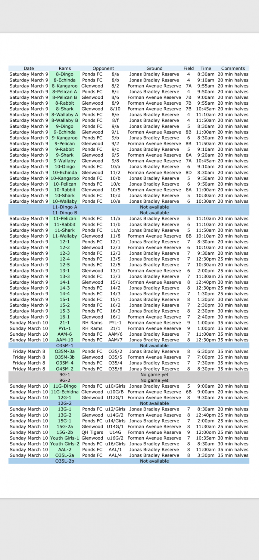 ***UPDATED*** Please see attached list which has been updated Please note that each team will need to nominate a referee for half of each game. Don’t forget the training shirts to be worn at all junior games